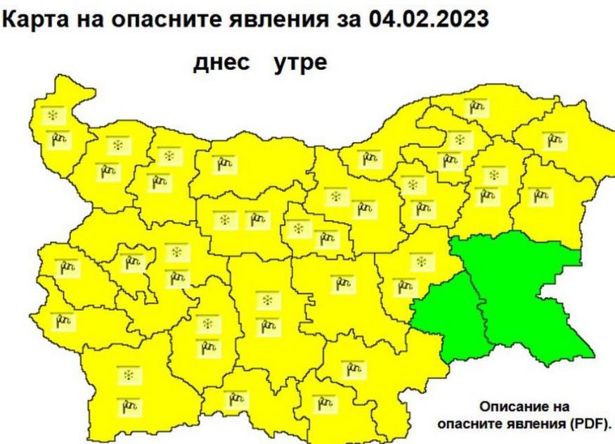 В областите Видин, Монтана, Враца, Ловеч, и Габрово, Велико Търново, Търговище, Разград, Шумен, Сливен, Пловдив, Пазарджик, Благоевград и София област ще духа мощен вятър, който в композиция със обилни превалявания от сняг ще сътвори условия за виелици и навявания. Само в областите Бургас и Ямбол не са оповестени рискови феномени за събота.