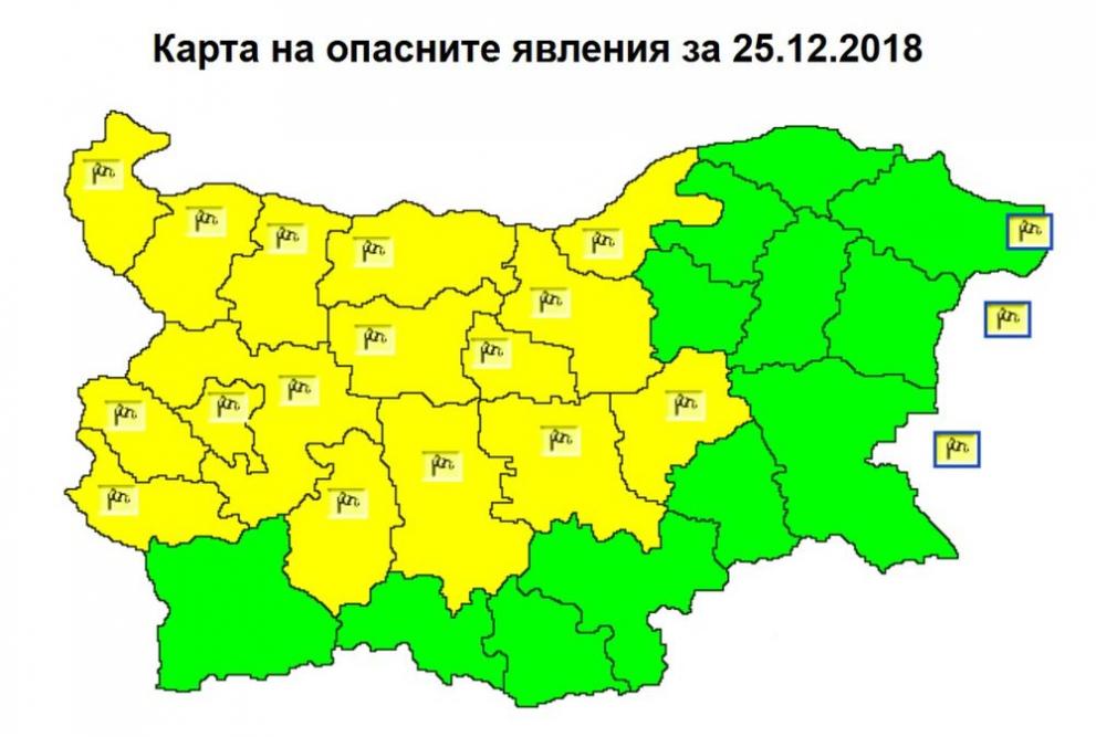 Жълт код за мощен вятър е разгласен за 16 области в страната . Предупреждението е в действие за областите Видин, Монтана, Враца, Плевен, Ловеч, Габрово, Велико Търново, Русе, Сливен, Стара Загора, Пловдив, Пазарджик, Кюстендил, Перник, София област и София град. В тези региони още при започване на денонощието, по преминаващия леден атмосферен фронт, ще стартира краткотрайно увеличаване напразно. Предупреждението е за пориви до 14-19 м/сек.