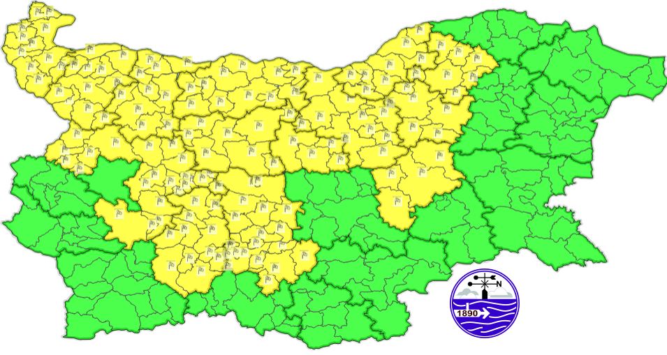 Кодът е в действие за областите Велико Търново, Видин, Враца, Габрово, Ловеч, Монтана, Пазарджик, Плевен, Пловдив, Разград, Русе, Сливен, София област и Търговище. Очаква се скоростта напразно да доближава 50-70 километра в час, а поривите му и до 90 километра в ча, оповестяват от Националният институт по метеорология и хидрология.
