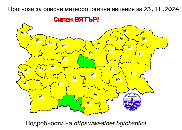 Жълт код за мощен вятър е разгласен за съвсем цялата страна и през днешния ден. В Пловдив се чака мощен вятър със скорост 14-19 m/s (50-69 km/h) и/или пориви до 24 m/s (90 km/h), оповестяват от Национален институт по метеорология и хидрология. През целия ден се чака да бъде облачно, а оптималните температури няма да надвишават 6-7 градуса. Възможни са и краткотрайни валежи.