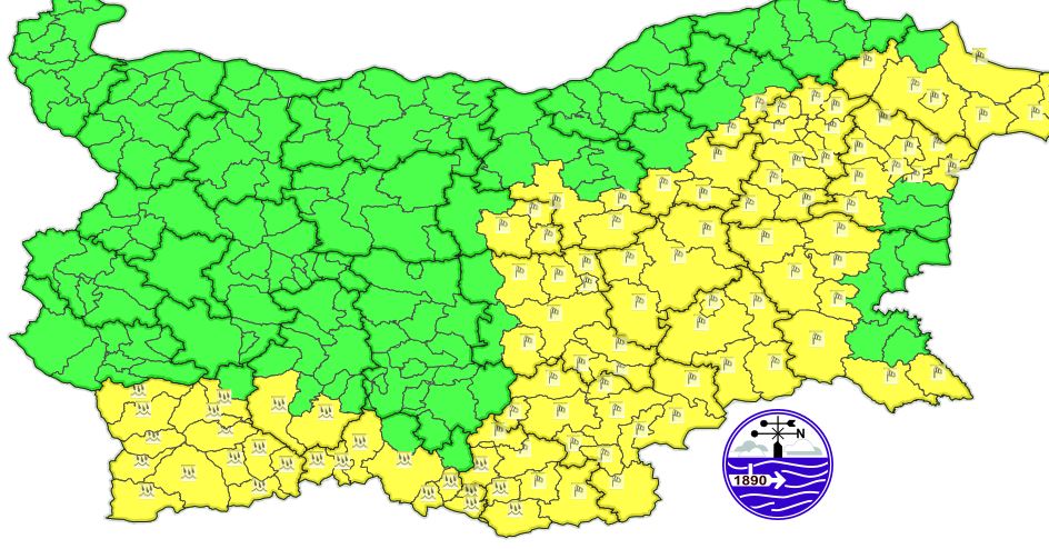 Предупреждението е в действие за областите Благоевград, Бургас, Варна, Велико Търново, Габрово, Добрич, Кърджали, Пазарджик, Разград, Сливен, Смолян, Стара Загора, Търговище, Хасково, Шумен, Ямбол.