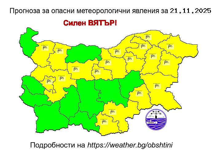 Жълт код за мощен вятър е в действие в 18 области от Западна, Северна, Източна и Южна България през днешния ден - Монтана, Враца, София, София-град, Ловеч, Габрово, Велико Търново, Търговище, Русе, Силистра, Разград, Добрич, Шумен, Варна, Бургас, Ямбол, Хасково и Кърджали.