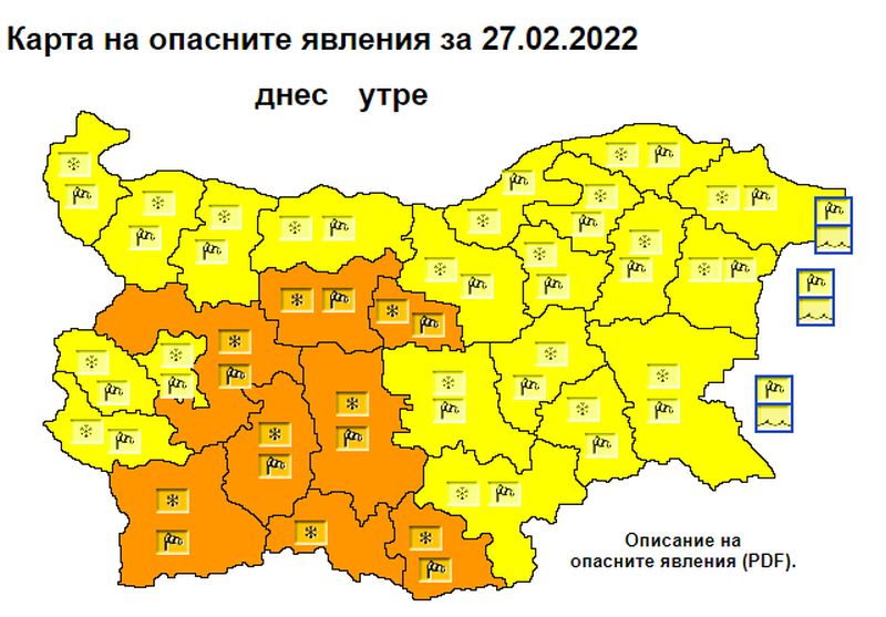 Оранжев код за мощен вятър и обилни снеговалежи важи в част от Западна България, Северна, Югозападна и Южна. На доста места ще се образува снежна завивка, а мощният вятър е причина за виелици и навявания, изключително в планинските региони.