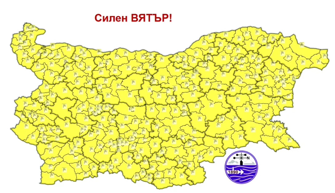 Жълт код за силен вятър в цялата страна и утре