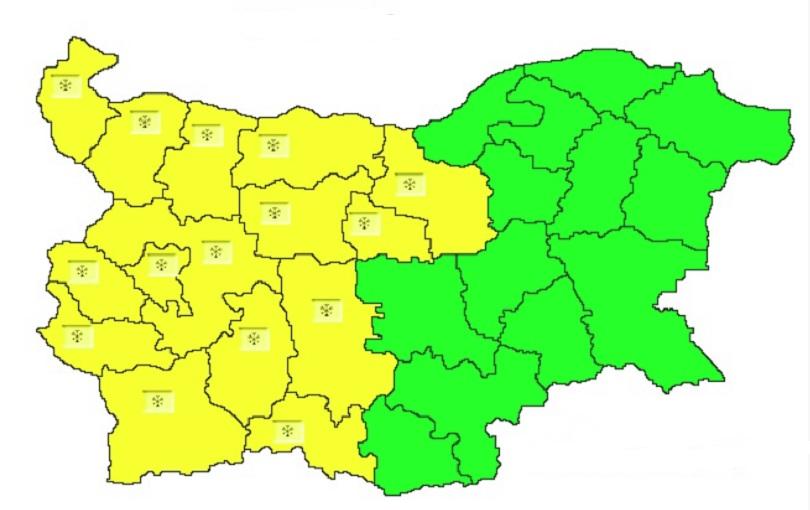 Жълт код за превалявания от сняг е разгласен в 15 области от страната на 15 януари, оповестяват от Националния институт по метеорология и хидрология (НИМХ) при Българска академия на науките.