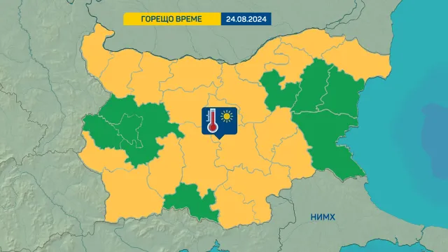 Национален институт по метеорология и хидрология издаде предупреждение от първа степен (жълт код) за горещо време в събота с оптимални температури сред 35° и 38° за областите: Благоевград, Видин, Враца, Велико Търново, Габрово, Кюстендил, Кърджали, Ловеч, Монтана, Пазарджик, Плевен, Пловдив, Разград, Русе, Силистра, Сливен, Стара Загора, Добрич, Хасково и Ямбол.