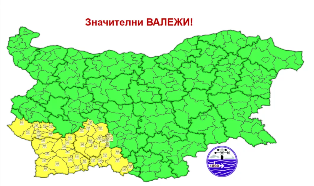Жълт код за обилни превалявания от дъжд за 5 декември е разгласен за областите Кюстендил, Благоевград, Пазарджик и Смолян, съобщиха от Национален институт по метеорология и хидрология. На доста места в западната половина от страната ще вали.