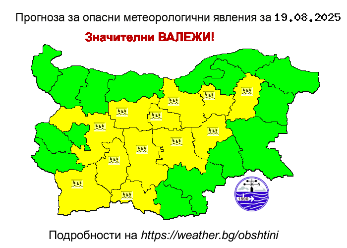 Жълт код за обилни превалявания с гръмотевици е разгласен за на следващия ден за областите Благоевград, Софийска област, Ловеч, Пловдив, Пазарджик, Смолян, Габрово, Стара Загора, Сливен, Шумен и Търговище. Възможни са местни наводнения, затруднено шофиране и спиране на действия навън.