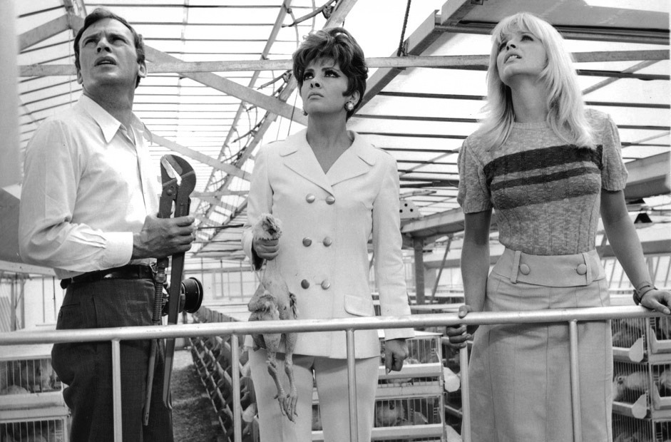 (Jean-Louis Trintignant, Ewa Aulin, and Gina Lollobrigida in La morte ha fatto l'uovo, 1968)