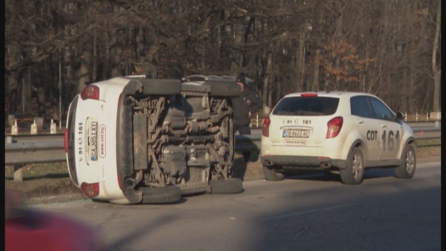 Служебен автомобил на охранителна компания удари друга кола, след което се обърна. Зад кормилото е била служителка на компанията. Според близки на пътувалия в другия автомобил, тя се е движела с непозволена скорост и е говорела по телефона сега на злополуката.
