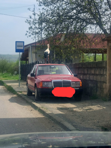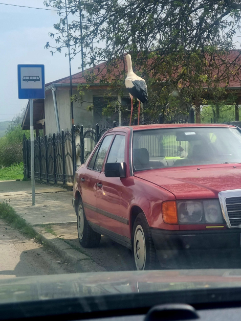 Автомобилът, върху чийто покрив се е разходил щъркелът, е бил паркиран на тротоар, наоколо до автобуска спирка.
