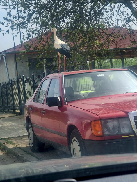 Ивайла Димитрова е решила да направи няколко фотоси на щъркела, кацнал върху автомобил. Фотосите тя разгласява в обществената мрежа Фейсбук.