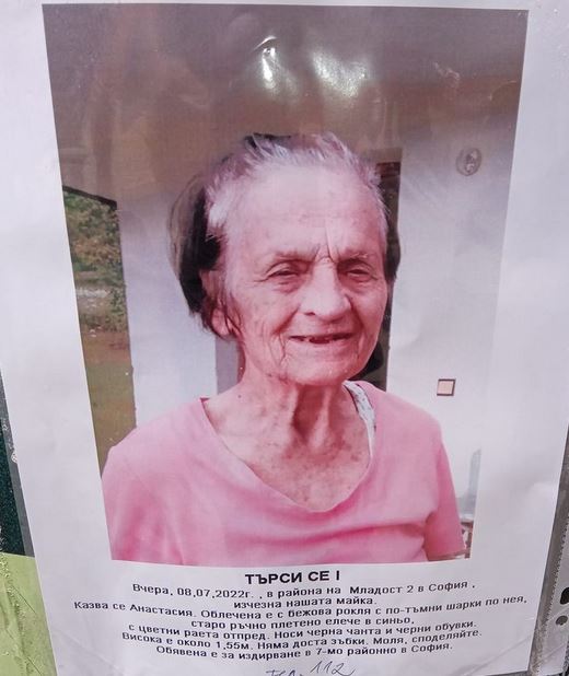 Жена изчезна в София, а нейните близки търсят информация за местонахождението й. Анастасия е в неопределеност от 8 юли. Тя е оповестена за търсене в 7-мо РПУ в столицата.