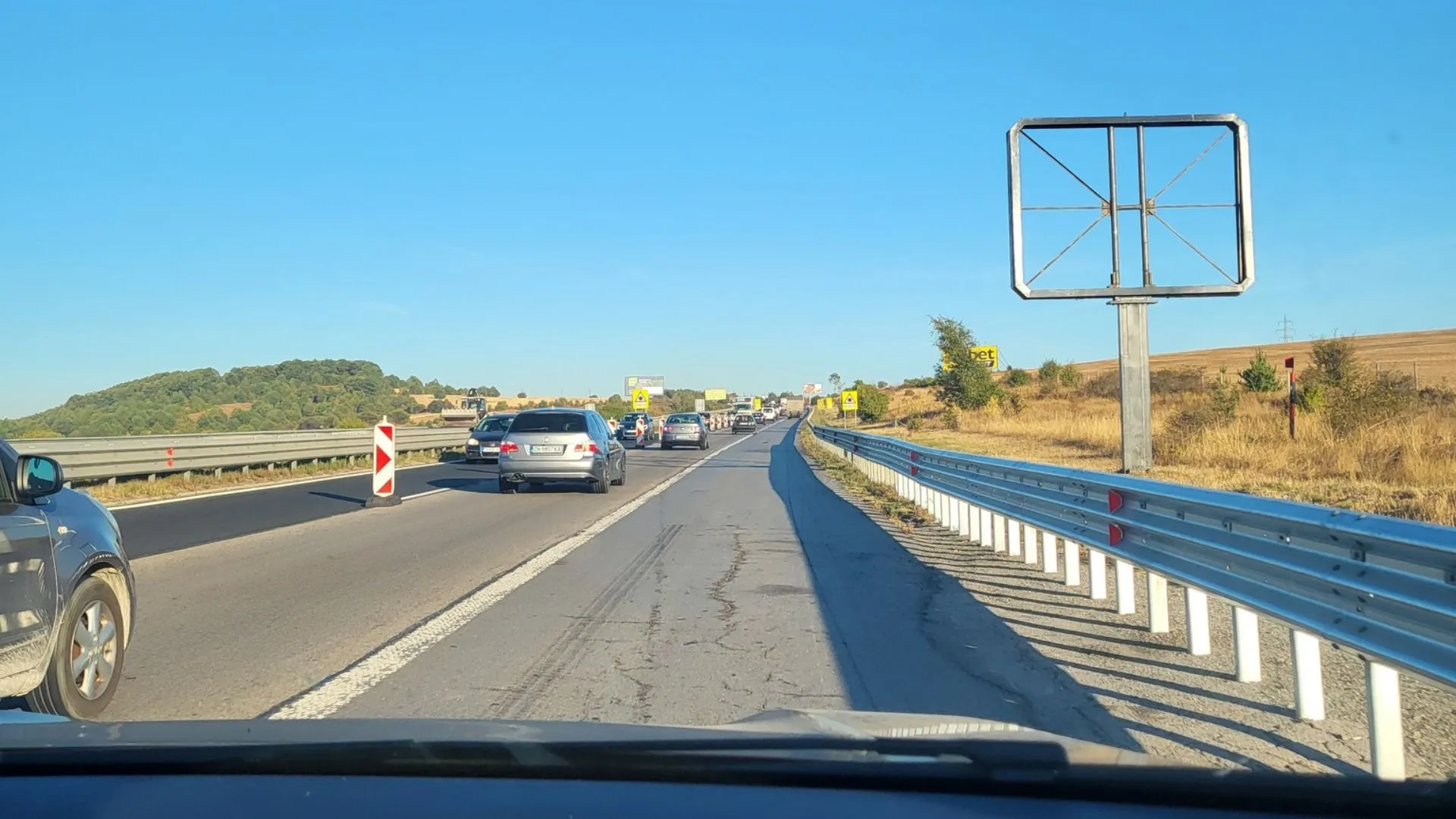 " В секторът на ремонта по Автомагистрала " Тракия " има този жълт знак. Той споделя, че в посоката на придвижване, могат да се употребяват 2 ленти, в това число и спешната! Той не разрешава придвижването на тежкотоварни МПС-та в " лявата " лента ", написа Димитър Ст. в поста си. Но, както се вижда от споделената от него фотография, доста хора не разпознават смисъла на този знак.
