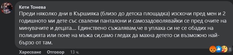 Пловдивчанка споделя и за още по-фрапиращ случай. " Преди няколко дни в " Кършияка " (близо до детска площадка) изскочи пред мен и 2-годишното ми дете със свалени панталони и самозадоволявайки се пред очите на минувачите и децата.