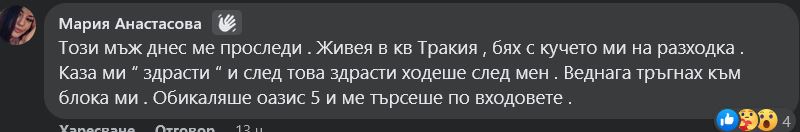 " Внимавайте и се оглеждайте за този човек, изключително към детските площадки!... Забелязан е в " Гагарин ", написа Магдалена Т. " Децата са го снимали инцидентно. Разголил се и така нататък Беше уплашил много щерка ми и друго детенце с непристойно държание, в това число и разголване ", прецизира тя.