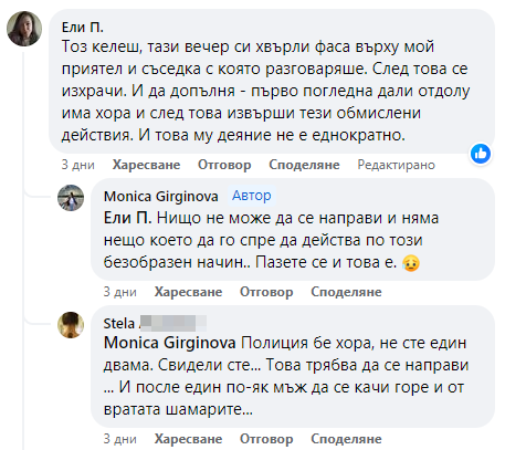 Ели П. пък твърди, че мъжът, който се вижда на фотосите, си е хвърлил фаса върху неин другар, а по-късно се изхрачил: