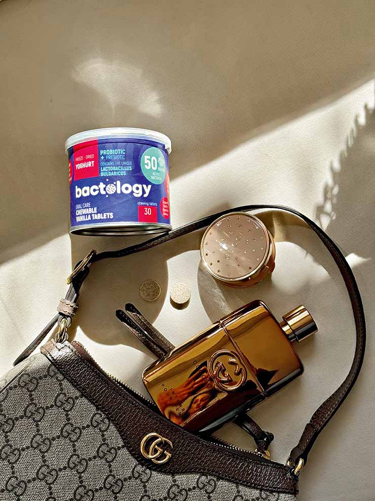 Жена в забързания делник, само че със замайващ жанр – надали може да си визиите тази картина без красивата усмивка. Тя трансформира излъчването, носи лекост и въодушевление във вихрения темп. Усмихнатото лице ни притегля и печели доверие. Затова наше обвързване е да се грижим за хубостта на усмивката. Всяка заран, преди да стартираме динамичния градски темп, едно малко допълнение към рутината ни – пробиотична таблетка Bactology – работи, с цел да поддържа усмивката ни сияйна и предпазена.