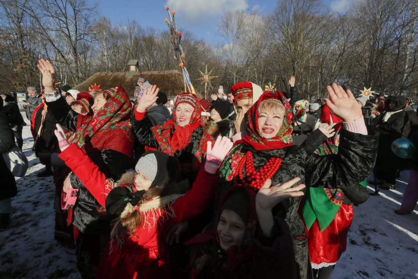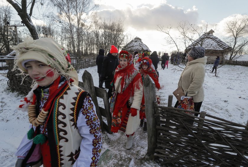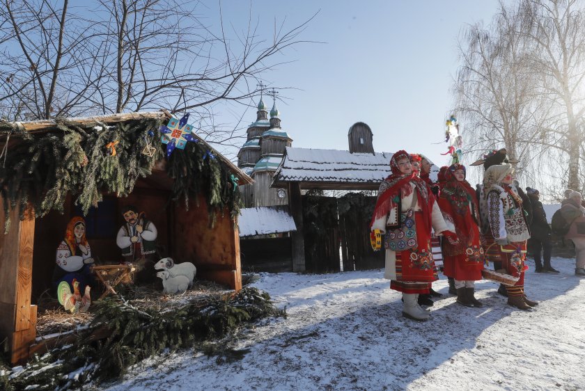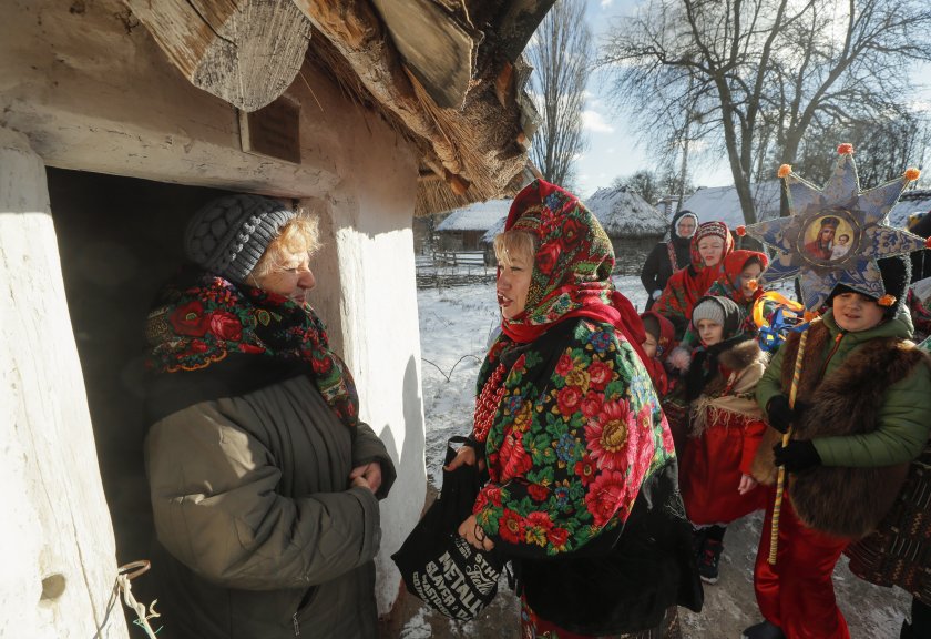 Жени и деца, облечени в обичайни дрехи, пеят коледни песни, до момента в който обикалят от къща до къща в село покрай Киев. Украинските вярващи честват православната Коледа съгласно Юлианския календар.