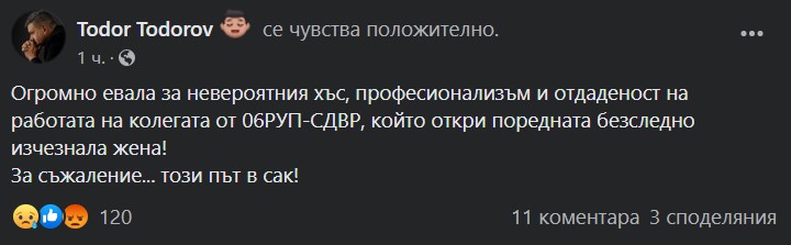 За зверството заяви престъпният психолог Тодор Тодоров: " Огромно евала за невероятния хъс, професионализъм и отдаденост на работата на сътрудника от 06 РУП-СДВР, който откри следващата безследно изчезнала жена!