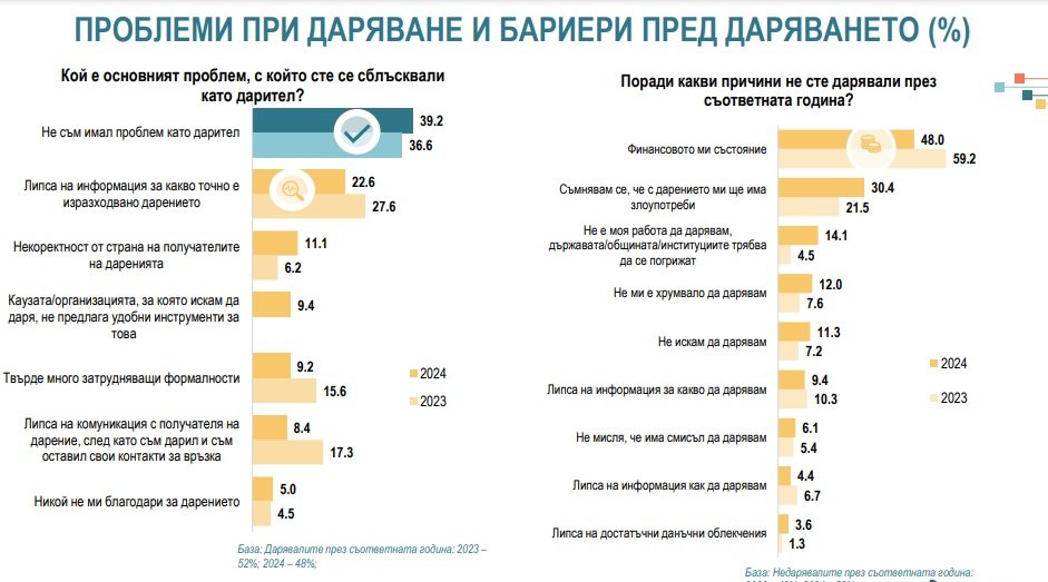 По данни от изследването през 2024 година малко под 48% от българите са дарявали, близо 53% – не. Проучването записва лек отлив в % на дарявалите през последните 12 месеца. Така обстановката с самостоятелното дарителство се връща към нивото от 2020 – 2021 година