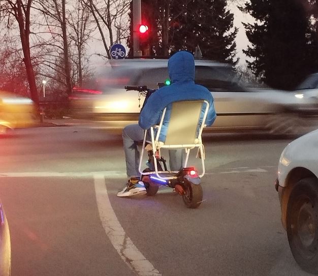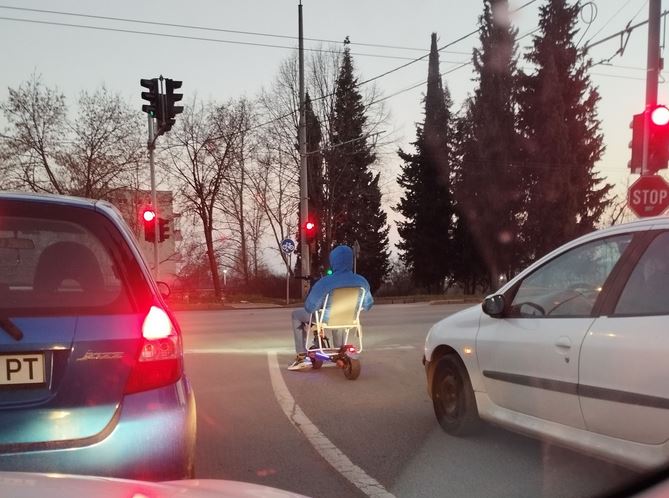 Жител на Стара Загора откри ексцентричен метод да се оправи с трафика и високите цени на горивата, само че провокира и съществени полемики за сигурността на пътя. Мъжът инсталира сгъваем стол върху електрическа тротинетка и по този начин се впусна в оживената пътна мрежа на града.