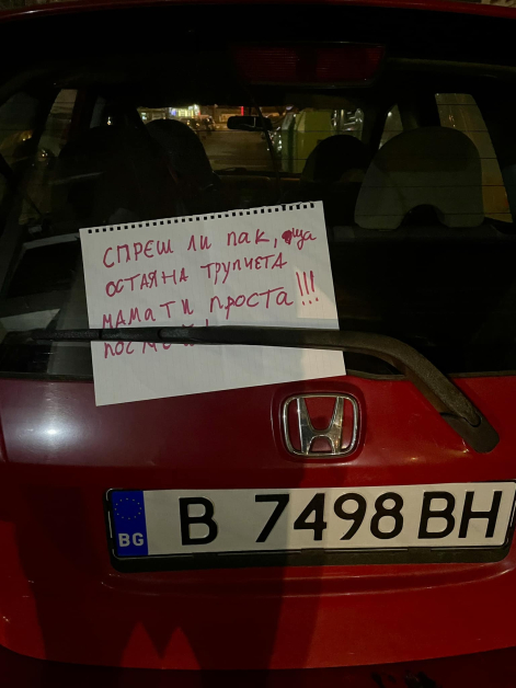 Жител на Варна разгласява във Фейсбук фотография на заплашителна записка, оставена на задното стъкло на автомобил, паркиран в регион „ Младост “. Съдържанието на бележката включва груби обиди и закани към притежателя на автомобила.
