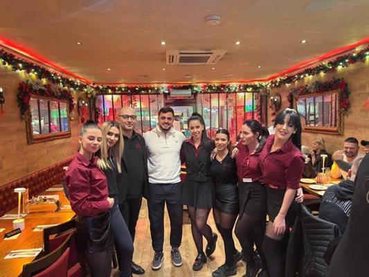 В другата механа Насар се радва на красиво женско внимание - певиците Алекса и Невена Димитрова, които греят с необятни усмивки до спортната ни легенда. Спортистът се снима и с част от личния състав, като на фрагмента ясно се вижда, че дамите още веднъж доминират. Въпреки женското внимание Карлос е правилен на новата си възлюбена, с която неотдавна се демонстрираха обществено - хубавицата Александра Костадинова. Тя е компактно до него в Лондон.