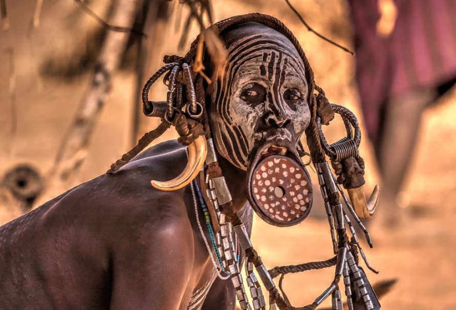 Те вървят с чинии в долната си джука. Нечовешкото разпъване стартира от 15-годишна възраст, а размера на чиниите зависи от мотива. Жените не са длъжни да ги носят от самото начало.