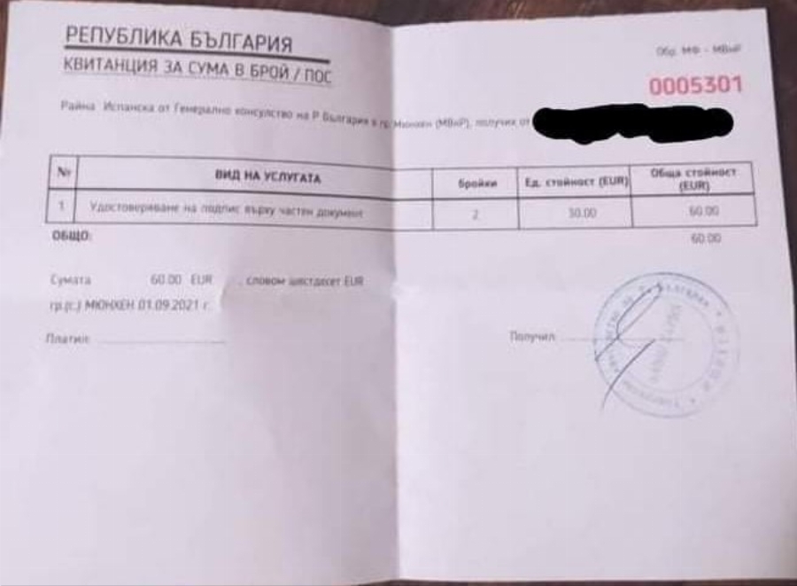 П. С. „ Току-що приказвам още веднъж с моята другарка... Взела е декларациите, забележете против 60 евро. Когато е попитала: „ Защо толкоз доста? “, служителката й дала отговор: „ Защото е експресно. Ако желаете да платите 30 евро, елате да ги вземете на следващия ден! “, макар че декларациите са лежали подготвени на бюрото. За съпоставяне в гръцкото посолство са платили 10 евро за същата услуга. Ще полудея след час записан три дни по-рано и след издаване на другия ден се смята, че услугата е експресна. Явно ние, българите, сме най-заможното племе в Европа ".