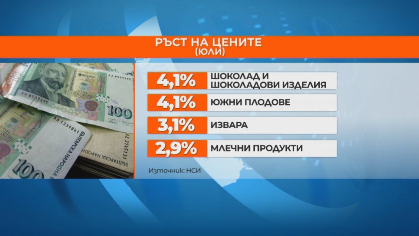 А какви са съответните цени. През юли с над 4% нарастват шоколада, сладките произведения и южните плодове, млечните артикули са с близо 3 на 100 по-скъпи. Поевтиняват както всекидневно сезонните зеленчуци с 16%, картофите с 12% и хляба със 10 на 100.