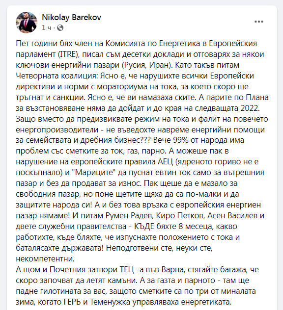 Бареков: Питам Радев, Петков, Василев - къде бяхте 8 месеца, какво работихте, къде бляхте, че изпуснахте положението с тока и баталясахте държавата?!