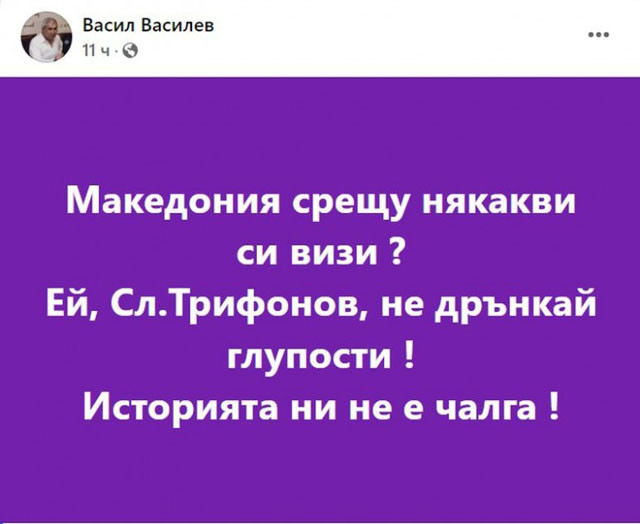 „ Македония против някакви си визи? Ей, Сл.Трифонов, не дрънкай нелепости! Историята ни не е чалга! “, написа във Facebook Василев.