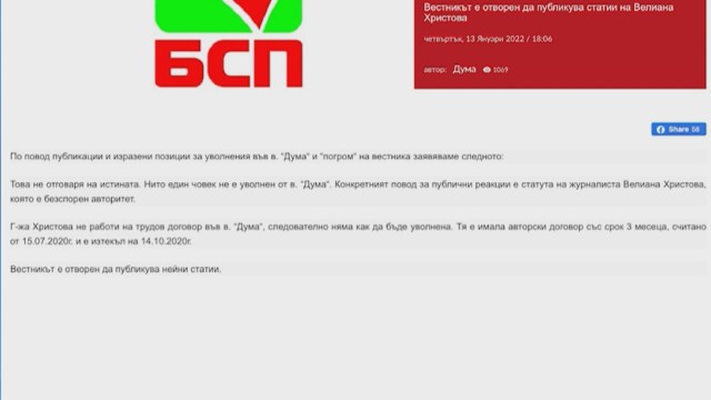 „ По мотив изявления и изразени позиции за уволнения във в. " Дума " и " разгром " на вестника заявяваме следното: Това не дава отговор на истината. Нито един човек не е уволнен от в. " Дума ". “