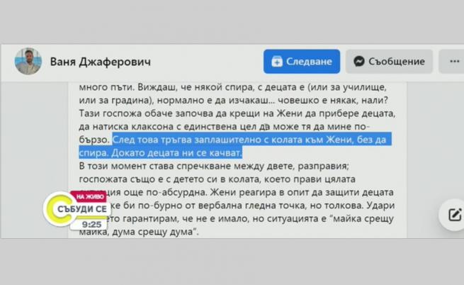 В този миг става сдърпване сред двете, разправия; госпожата също е с детето си в колата, което прави цялата обстановка още по-абсурдна. Жени реагира в опит да отбрани децата си; може би по-бурно от вербална позиция, само че толкоз. Удари в лицето подсигурявам, че не е имало, само че обстановката е "майка против майка, дума против дума ", написа Ваня Джаферович във Facebook.