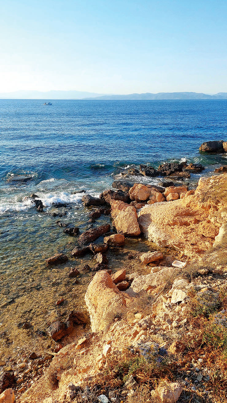 И ето ме на острова. Денем Егина е огряна от светлина, която пленява, а нощем се взира в звездите, с цел да откри пътя си. Има ли тъга в душите на хората, които изпитват наслада, че виждат; че са живи? Изворът на тази наслада, който блика вътре в тях, ги прави щастливи даже в меланхолията. Художници и скулптори, поети и писатели, които са изгубили пера от крилете си, са тук, както в миналото, и се стремят да намерят път за бягство от действителността в полета на въображението. През зимата жителите на Егина чуват ветровете от четирите направления на света и стоят заключени в домовете си, радвайки се на тишината и спокойствието. Те чакат Еол да прибере в кожената си торба вихрушките и да я завърже крепко, с цел да изпълнят още веднъж улиците. През лятото пък се радват на хората. Целият им живот е зависещ на ритъма на морето. Мечтите им основават света им.Егина е най-големият остров в Сароническия залив. Има форма на сърце. Затова и хората са благи и приказват с ръка на сърцето. Ако човек огледа острова откъм морето, ще види по какъв начин голите хълмове на Егина се спускат гладко във водата, а вълните се разрушават в скалистия бряг с пяна и екот. Сякаш някой е сплел венец от къщите и е закичил острова с него. Хора вървят по крайбрежията с приятност и усещат покой в себе си. Свободни са. Онова, което са били, все някой помни. В душите на островитяните няма пустош. Те са разнообразни. Като острова.
