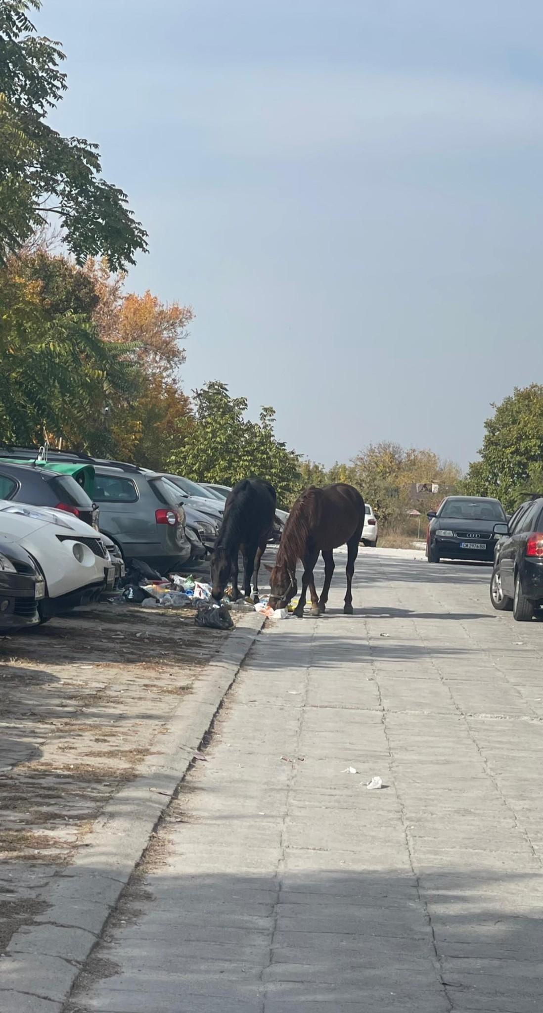Междувременно други два коня " похапват " от боклуците, които изсипани на земята, в постройката на университет в Пловдив. " Домашните любимци на ПУ ", пише Анита Илинова, която е споделила фотография.