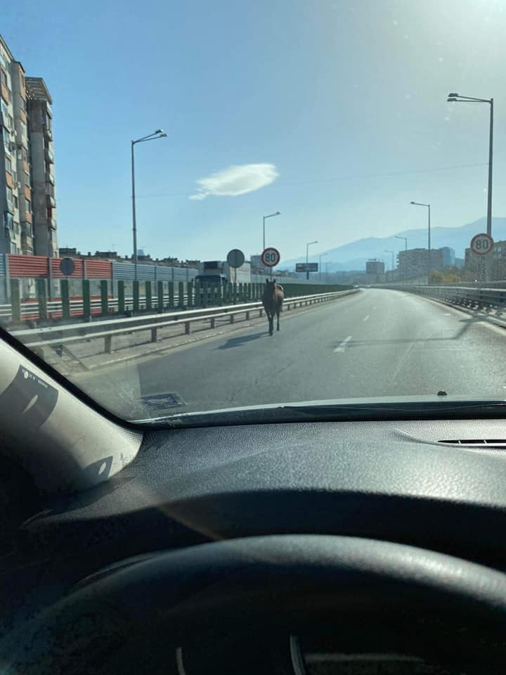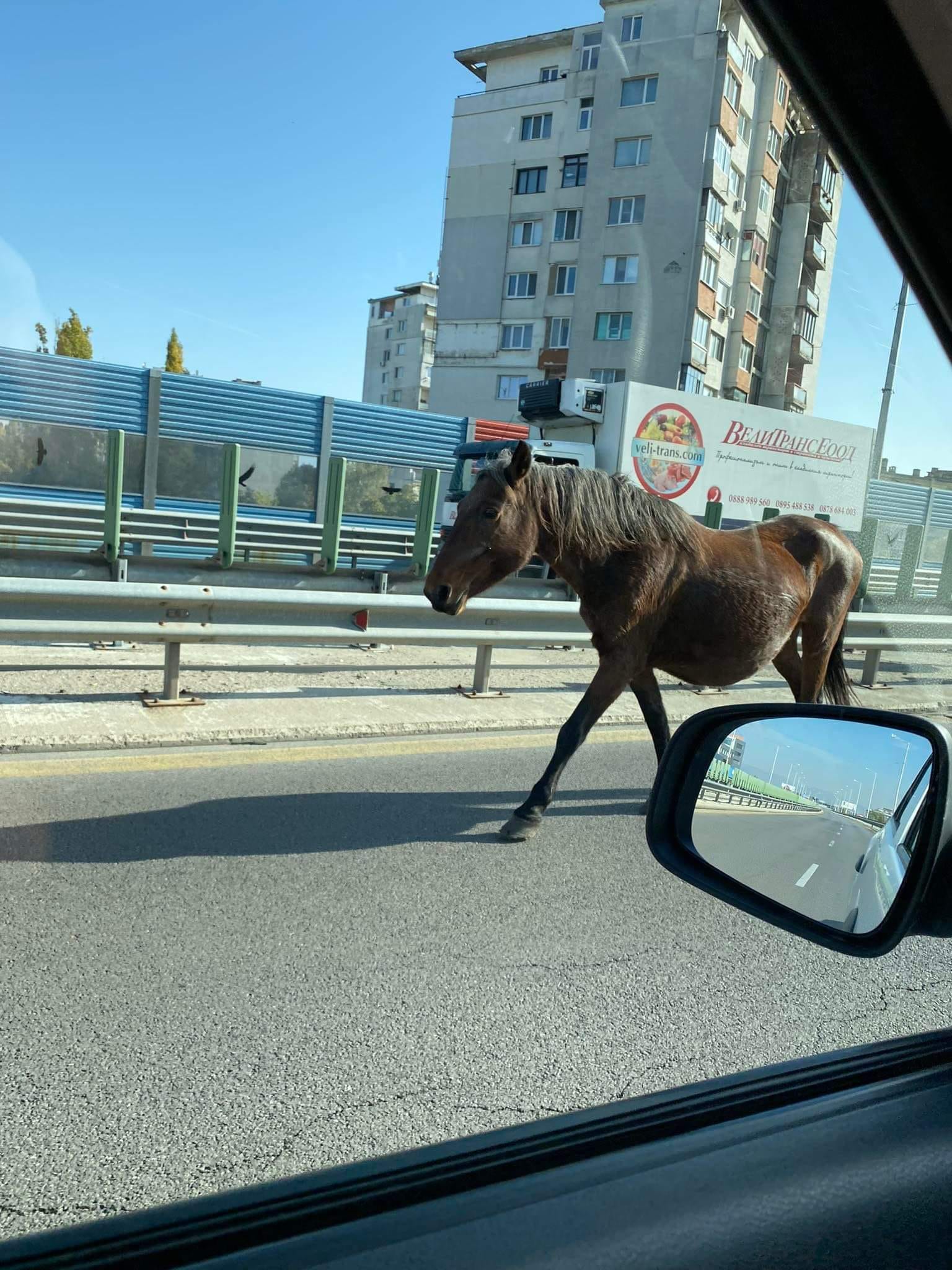 Кон препуска в насрещното придвижване на бул. " Брюксел " в регион " Искър " в столицата. Животното е видяно от пътуващи, които са го снимали. Фотосите бяха оповестени в обществената мрежа Facebook.