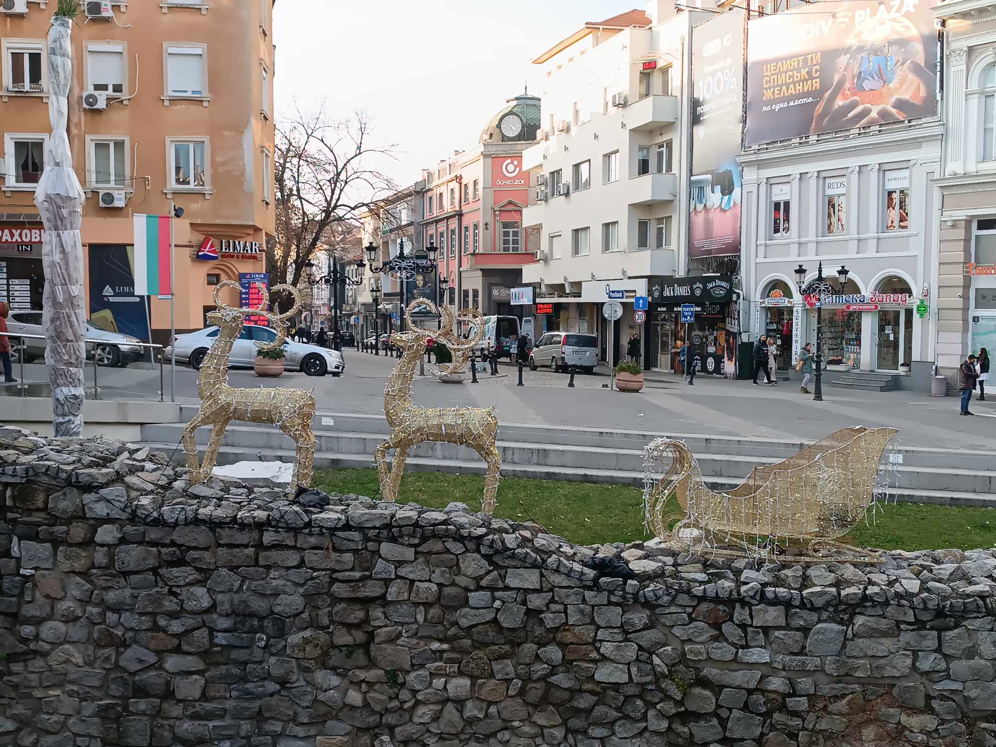 2023 година очевидно ще е друга – няма ги обилните декорации, гирляндите, светлинките, празничните орнаменти. Поставени са единствено елхата на площада пред постройката на Общината, а до нея една светеща апаратура с формата на коледна шапка. Срещаме на места няколко тръбовидни лампички по уличното осветяване и миналогодишната шейна пред Джумаята. Моравата пред Общината пустее. Тази зима не са инсталирани даже спорните декорации, за които преди две години общината похарчи близо 36 000лева. Макар да бяха дело на топ дизайнерка, естетиката им беше противоречива през цялото време. През 2022г. обаче се оказа, че по тях протича ток и това ги прави рискови за хората. По тази причина няма да ги забележим този декември.
