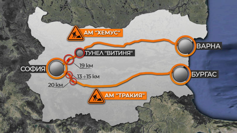 Ремонти по автомагистрала " Хемус " ще има и през лятото. Продължава работата по надлеза при село Потоп и рехабилитацията на тунел " Витиня ". На " Тракия " ускорено се работи сред 13-тия и 15-тия километър, както и на 20-тия. В тези сектори придвижването се прави в двете посоки, в едното платно от автомагистралата.