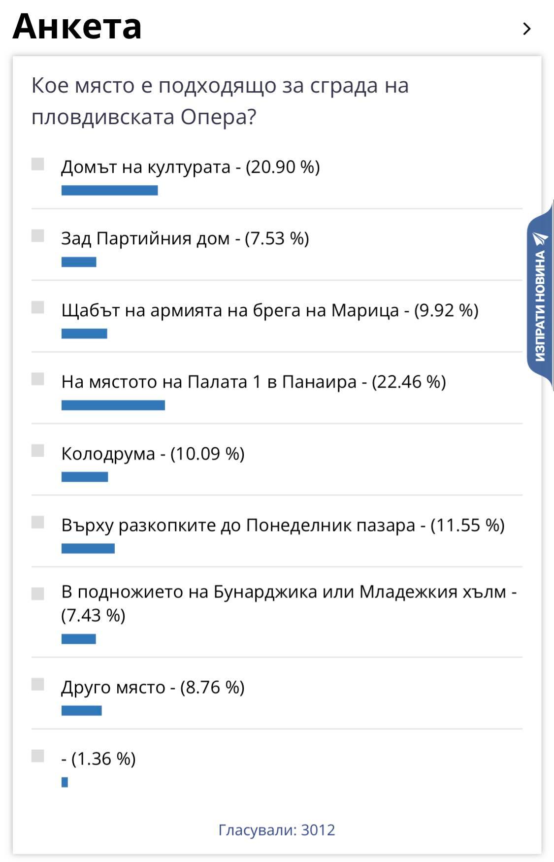 Близо 10% са на мнение, че щабът на армията на брега на Марица би било добра локация за постройката. С два % повече са тези, които мислят, че операта би трябвало да бъде върху разкопките на Понеделник пазара. 7,5% поддържат концепцията постройката да бъде зад Партийния дом. 10% от гласувалите поддържат концепцията на кмета, постройката на операта да бъде издигната на терен до зала " Колодрума ".