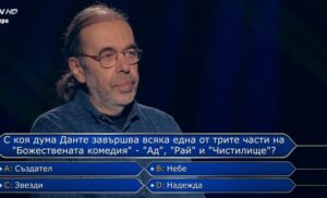 Питане №14 в играта на Лазаров бе следното: „ С коя дума Данте приключва всяка една от трите елементи на „ Божествената комедия “ – „ Ад “, Рай “ и „ Чистилище “? “ Вариантите, от които той трябваше да избира, бяха „ Създател “, „ Небе “, „ Звезди “ и „ Надежда “.