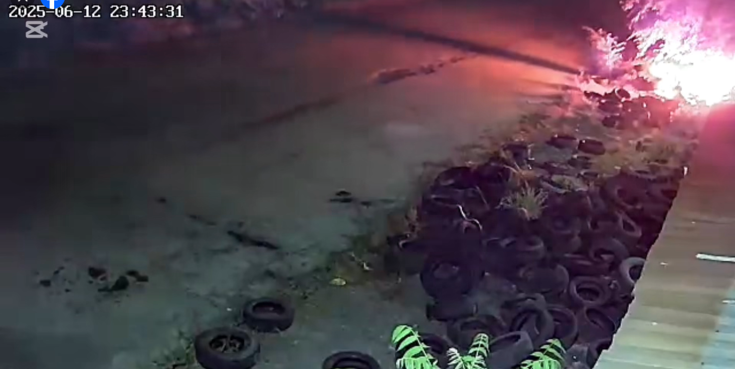 На него се вижда по какъв начин мъж се върти към изхвърлените гуми, отива зад околните шубраци, а по-късно бързо си потегля. Малко по-късно се вижда, че точно оттова стартира огънят.