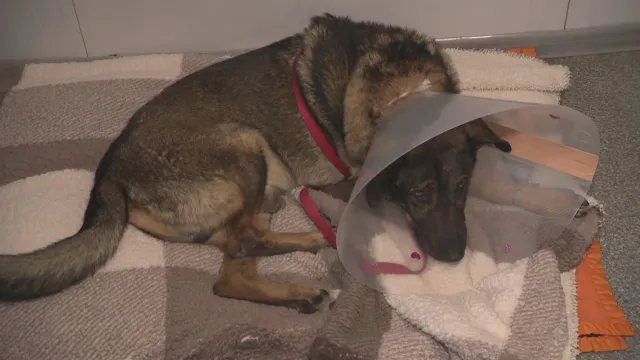 Настанена във ветеринарна клиника към подслон, където е опериран. Приет е в безпомощно положение – със счупвания, прорезни рани и в загуба на доста кръв.