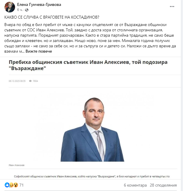Това написа на своята фейсбук страница юрист Елена Гунчева, която в предходния парламент беше част от " Възраждане ", а по-късно напусна партията със скандал. Повод за коментара й стана новината, че някогашният общински съветник от СОС Иван Алексиев беше пребит. Гунчева няма и подозрение, че побоят е възмездие от страна на " Възраждане ".