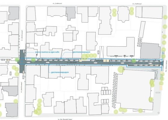Другият вид планува вместо паркинг при Министерството на спорта да има пешеходно пространство и зеленина. Според плана пътното платно тук-там се причислява към тротоара, засаждат се дървета и се слагат пейки, както и краткотрайни обекти, тъй че да се образува своеобразен " остров " и улицата да стане с леки завои - шикани. Целта е колите да не могат да карат бързо. При този вид местата за паркиране ще са 13, а новозасадените дървета - 12.