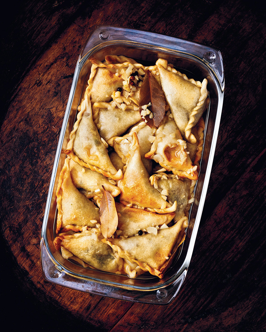6. Загрей фурната до 180 градуса по Целзий. Постели два огромни листа хартия за печене. Раздели тестото на две топки. Остави едното в купата покрито, до момента в който работиш с другото. Върху щедро набрашнена повърхнина разточи тестото на доста тъничък правоъгълник 30 на 40 см с дебелина към 2 см. Нарежи тестото на 5-сантиметрови квадратчета. Сложи една чаена лъжичка заряд на всеки квадрат. Постави единия борд на квадрата диагонално над пълнежа, с цел да оформиш триъгълник. Щипни крепко краищата, с цел да се запечатат. С пръсти направи плисета на запечатаните ръбове. След като кнедлите са подготвени, подреди ги върху квалифицирания лист за печене. Направи същото и с втората топка тесто.