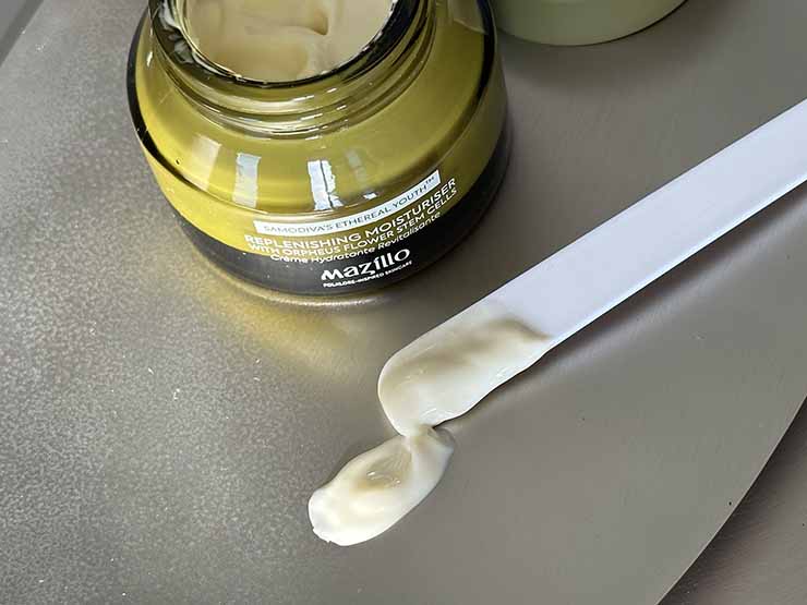 Всеки ден хидратацията на кожата ми е поверена на регенериращия крем Replenishing Moisturiser със стволови кафези от Орфеево цвете на Mazillo. Формулата му е 100% натурална, растителните стволови кафези подтикват синтеза на колаген и подкрепят битката против пигментацията. Нанасянето му носи извънредно наслаждение поради меката му текстура и чувството за деликатност, което оставя. Необходимо е напълно малко количество за цялото лице. Освен да хидратира, той уплътнява кожата ми, която е много тънка, и изравнява тена й.