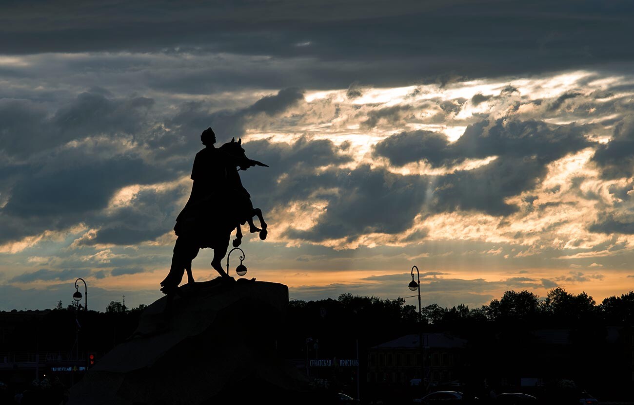Максим Блинов/Sputnik Паметникът „Бронзовият конник“ на Петър Велики посреща залеза в Санкт Петербург през сезона на Белите нощи през юни.