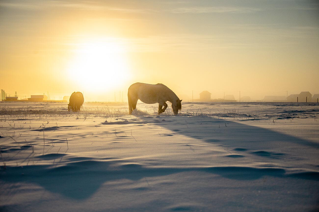 Залезът на слънцето в един къс и студен зимен ден в Република Якутия.